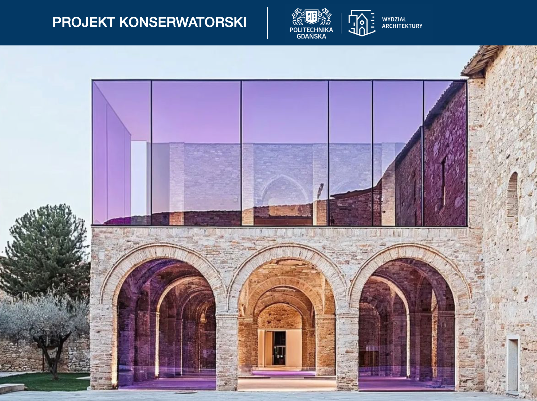 Zadaniem kursu projektowania konserwatorskiego jest opracowanie projektu architektonicznego w oparciu o studium historyczne i autorską waloryzację konserwatorską obiektu/zespołu zabytkowego, a w konsekwencji uzyskanie wiedzy na temat architektonicznych i urbanistycznych uwarunkowań projektowania konserwatorskiego.