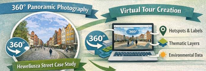 This course focuses on the urban and architectural analysis of a selected case study street through the post-production and application of 360° panoramic photography to create an informative virtual tour. The tour will be developed using a series of on-site pano360 captures from Heweliusza Street in Gdańsk.