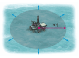 | Pole i promień cały czas rosną, ale zasadnicza różnica jest taka, że promień zwiększa się ze stałą prędkością 30m/h, pole natomiast rośnie coraz szybciej (przyjrzyj się animacji obok). My szukamy prędkości z jaką rośnie pole w momencie gdy promień wynosi dokładnie 100m. |