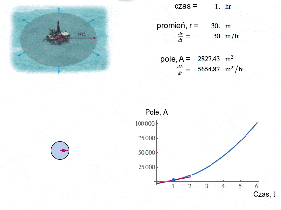Aby podkreślić, że zarówno promień \(r\) jak i pole \(A\) zmieniają się w czasie, wygodnie jest użyć oznaczeń \(r(t)\) i \(A(t)\). Wówczas wzór na pole, dający związek między polem i promieniem w każdym momencie czasu, zapisujemy