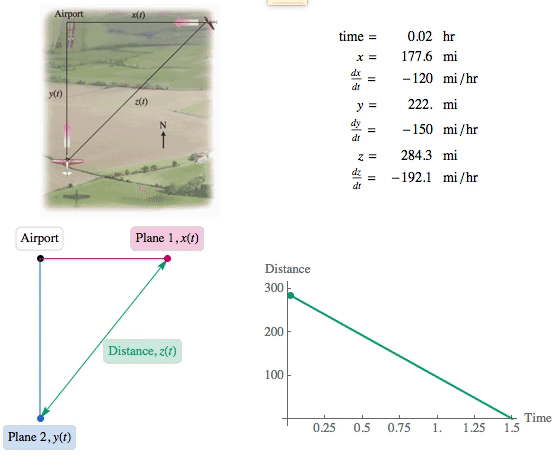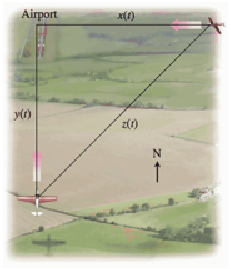 Rysunek, taki jak pokazany wyżej, jest pomocny do wyobrażenia problemu i uporządkowania informacji. Tutaj trzy długości zmieniają się jednocześnie w czasie: odległość od lotniska samolotu lecącego na zachód, oznaczmy ją \(x(t)\), odległość od lotniska samolotu lecącego na północ, oznaczmy ją \(y(t)\) i odległość pomiędzy samolotami, oznaczmy ją \(z(t)\).