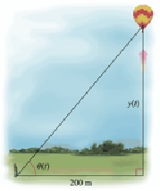Jak zawsze, rysunek, taki jak pokazany wyżej, jest pomocny do wyobrażenia problemu i uporządkowania informacji. Tutaj dwie wielkości zmieniają się jednocześnie w czasie: wysokość balonu nad ziemią, oznaczmy ją przez \(y(t)\) i kąt elewacji, oznaczmy go przez \(\theta(t)\).