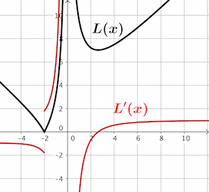 \(L'(x)=\frac{x^4+2x^3-18x-36}{x^3\sqrt{(x+2)^2+9\cdot\frac{(x+2)^2}{x^2}}}\)