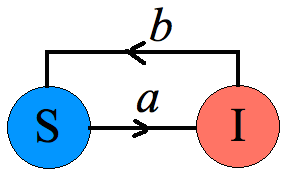 \(I'(t)=(aS-b)I=a\left(S-\frac{b}{a}\right)I\)