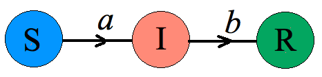 \(\begin{cases}S'(t)=-aSI\\I'(t)=aSI-bI\\ R'(t)=bI\end{cases}\)
